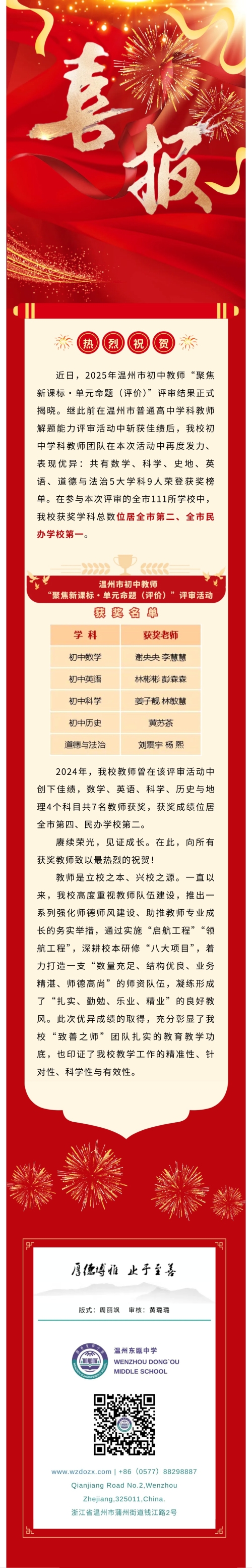 喜报 | 温州东瓯中学在温州市初中教师“聚焦新课标·单元命题(评价)”评审活动中再创佳绩